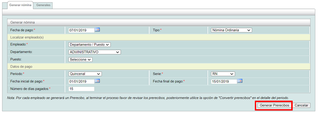 Llene los datos de generación de nómina y de click en "Generar Prerecibos".