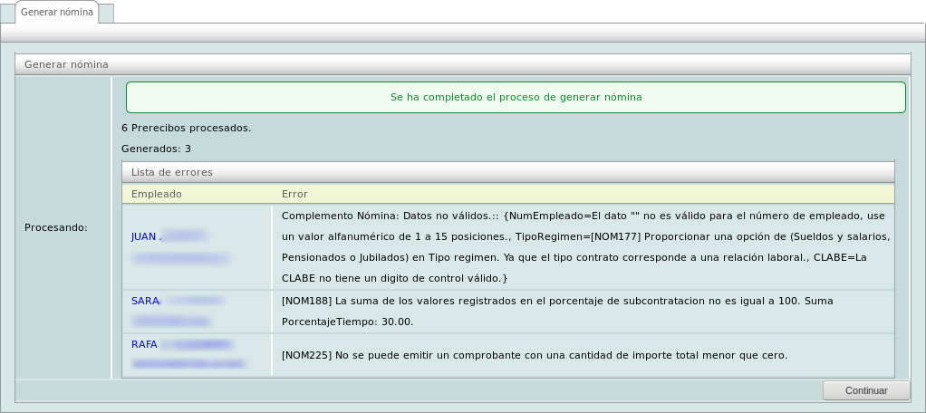 El sistema le informará cuantos de los prerecibos sí fueron generados sin errores; también le mostrará cuantos no se generaron y porqué. De click en el botón "Continuar" para ver los prerecibos generados.