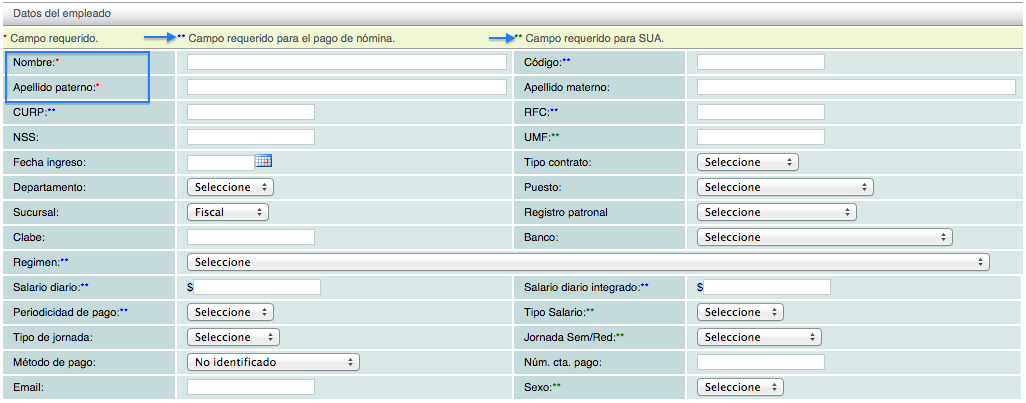 Los campos marcados con "*" asterisco son de caracter obligatorio, el resto de los datos solicitados en este bloque son de carácter informativo y solo le ayudan a mantener una mayor información de su empleado.