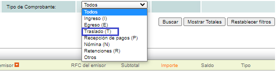 Para poder visualizar las cartas porte es necesario seleccionar la opción"Traslado (T)", de click en el botón de "Buscar".