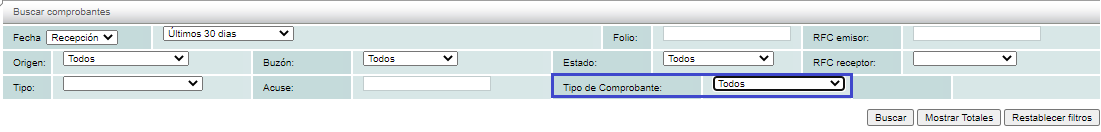 Dentro de la interface encontrará los diferentes tipos de filtros, en este caso es necesario seleccione la opcion "Tipo de comprobante"
