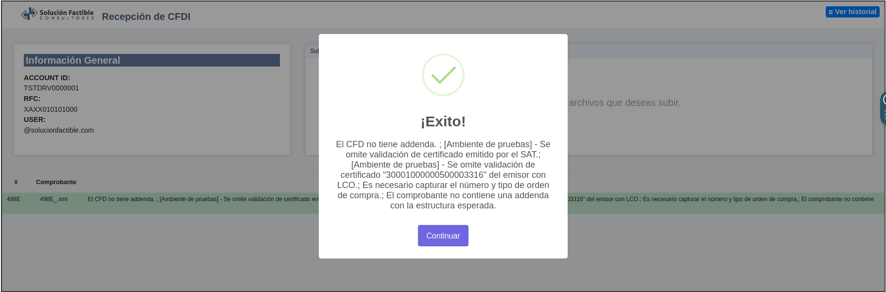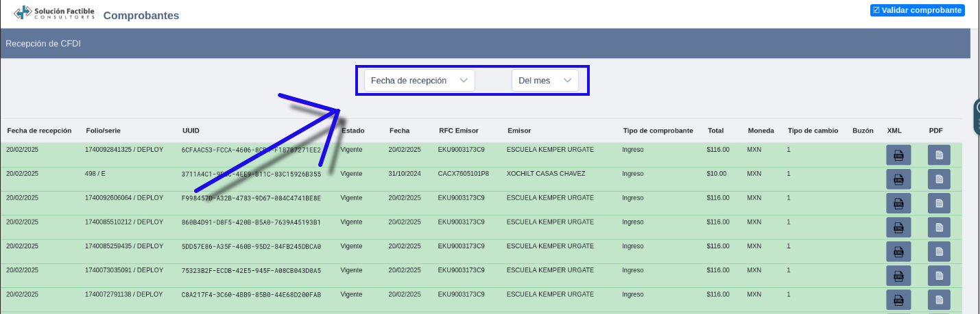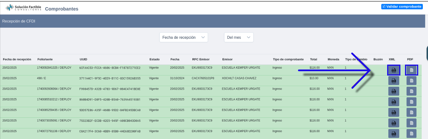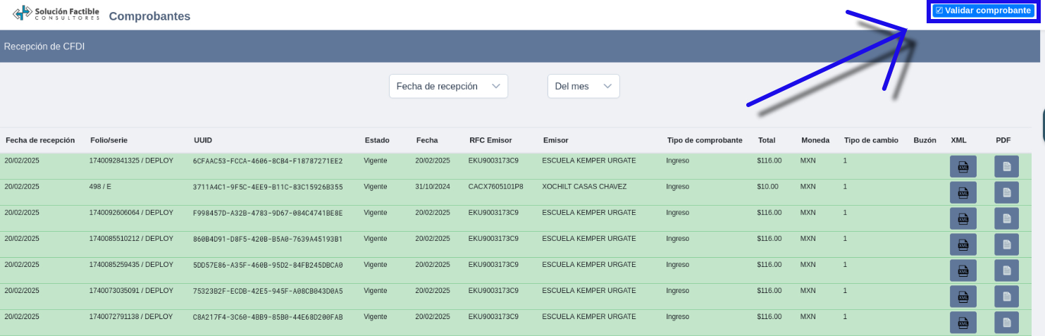 It is also possible to return to the e-document validation screen by clicking on the "Validar comprobante" button in the upper right corner.