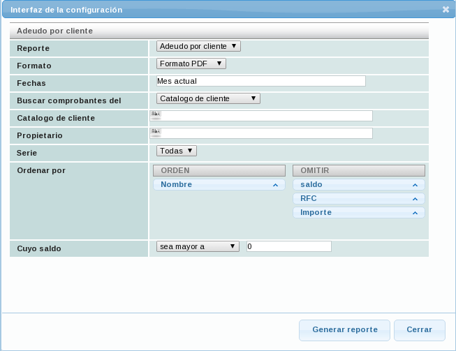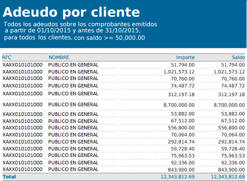 del RFC, nombre del cliente y los importes totales del adeudo.