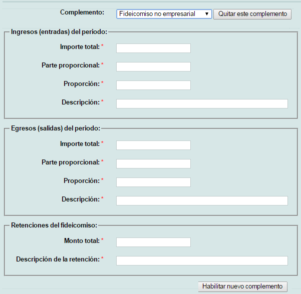 El sistema le mostrará el formulario para ingresar los datos del complemento, los campos marcados con "*" (asterisco) son obligatorios.