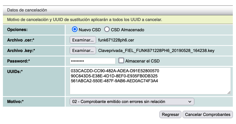 Provide the .cer, and the .key files, and the private key password. And click the "Cancelar Comprobantes" button.