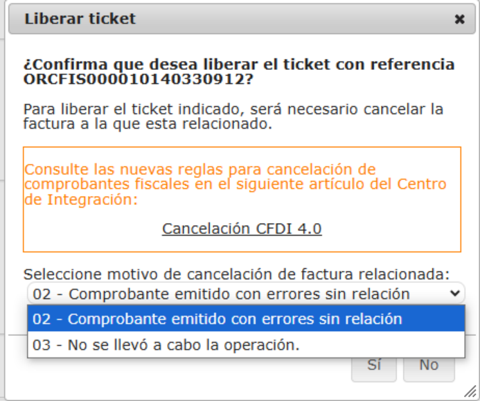 El sistema confirmará la liberación del ticket. Seleccione el motivo de la cancelación de la factura relacionada.