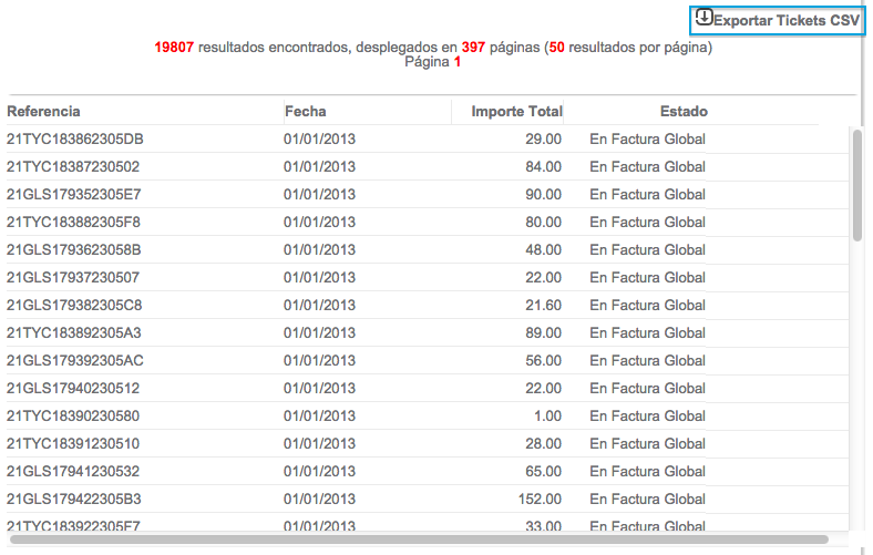 El sistema le presentará los datos del ticket (fecha, importe total y el "estado"), de este modo podrá darse cuenta si el ticket está o no facturado.