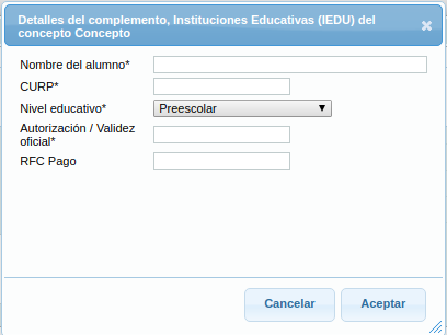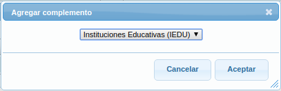 El sistema mostrará una nueva ventana, donde deberá seleccionar el complemento "Instituciones Educativas(IEDU)" y dar click en el botón "Aceptar"