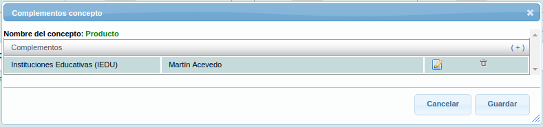 El sistema mostrará una ventana con la información del concepto. Para agregar el complemento dé click sobre el botón (+), que se encuentra del lado derecho de la ventana emergente.