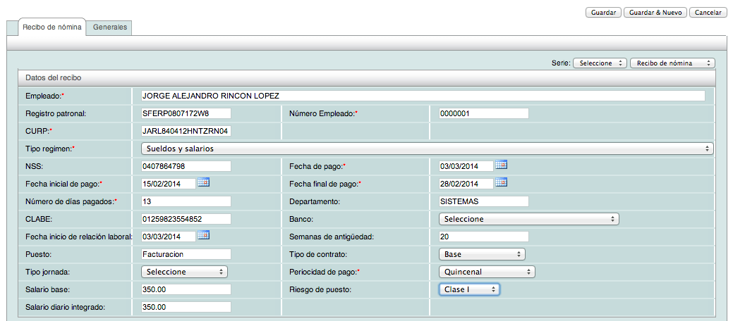 Para iniciar con la creación del recibo seleccione al empleado previamente registrado en el sistema, en seguida ingrese la información que se le solicita.
