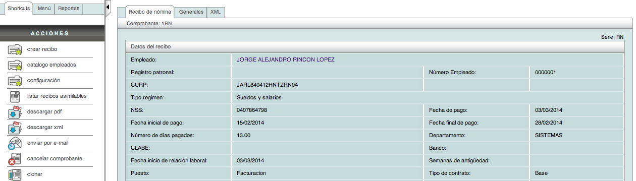 Una vez guardado el recibo podrá realizar diferentes acciones, entre ellas puede descargar el PDF y XML del comprobante, para realizar esta acción diríjase al menú “Acciones” y seleccione la opción deseada.