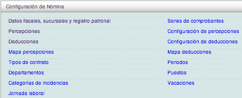 Es necesario que registre los distintos "Departamentos" (áreas) que existen en su empresa, para realizar esta acción diríjase al módulo "Nómina" y dentro del menú "Acciones" dé click en la opción "Configuración".