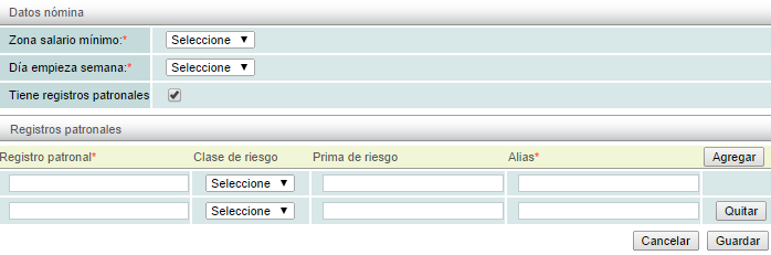Capture la información requerida, para ingresar el registro patronal, seleccione la casilla de la opción “Tiene registros patronales”, en el caso de tener más de un registro patronal seleccione el botón "Agregar", capture los datos y dé click en el botón "Guardar".