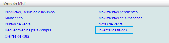 En el menú de MRP, seleccione la opción “Inventarios Físicos”.