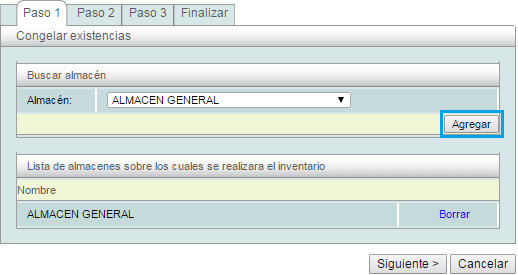 Paso 1: Seleccione el almacén al cual estará vinculado el inventario, presione el botón de agregar, una vez que este agregado el almacén en la parte inferior dé click en siguiente.