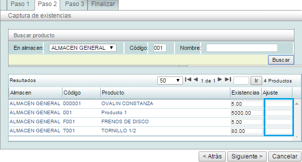 Paso 2: Agregue los ajustes de los productos del inventario físico una vez terminado el ajuste presione el botón de siguiente.