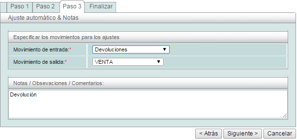Paso 3: Seleccione un movimiento de entrada y de salida así como las observaciones de los movimientos, una vez terminado presione el botón de siguiente.
