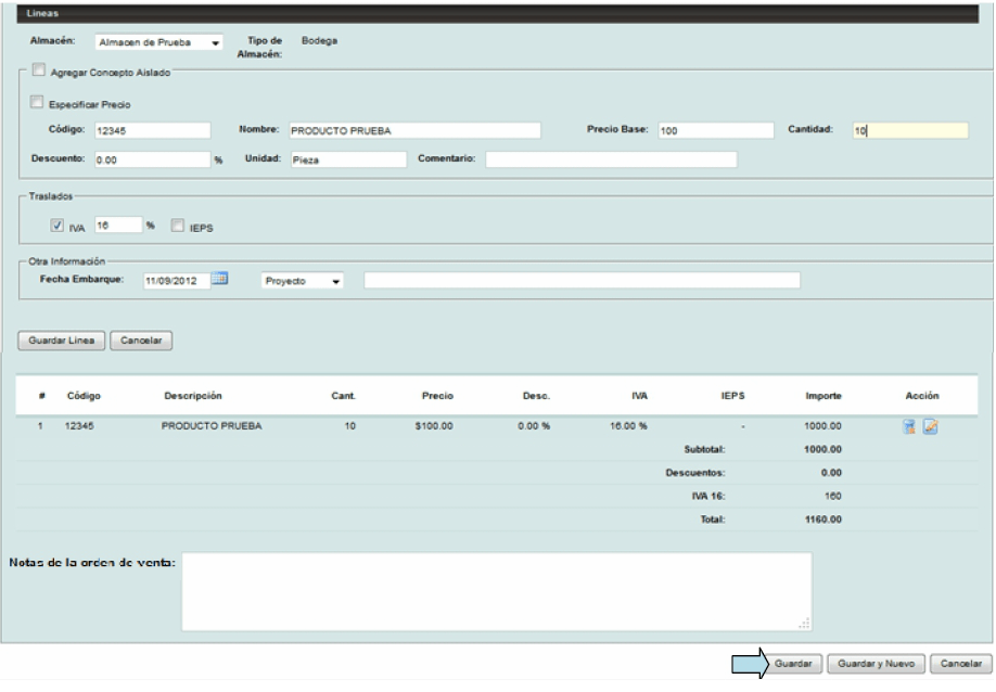 Nota: para agregar el producto dé click sobre el botón "Guardar Línea".