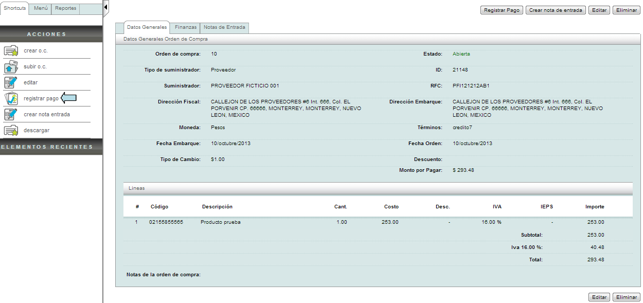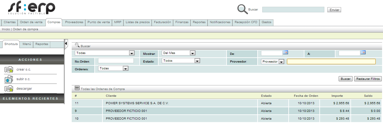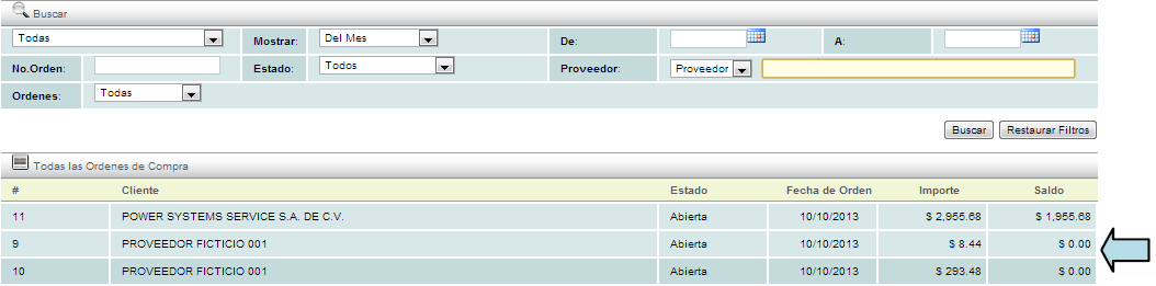 En el módulo "Compras" encontrará las ordenes de compra previamente guardadas, dé click sobre la orden deseada para ingresar a la misma.