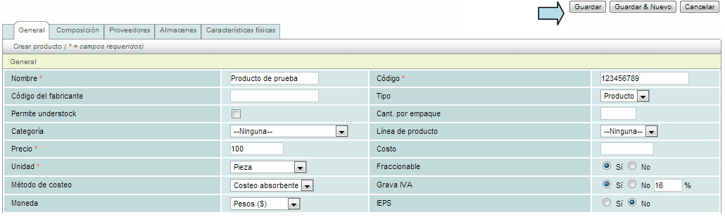 Una vez terminado el registro del producto dé click en el botón "Guardar" de esto modo su producto quedará guardado en la base de datos. Un producto generado en el sistema puede ser editado o eliminado posteriormente.