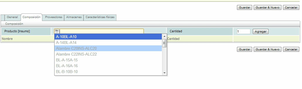 Si su producto se compone de uno o más "insumos" usted puede registrarlos en esta sección.