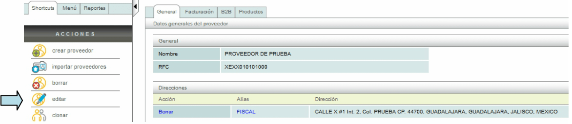 Una vez registrado su proveedor usted puede realizar varias opciones, dentro del menú "Acciones" podrá editar, borrar o clonar a dicho proveedor.