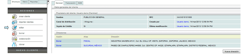 Para editar o agregar información a un cliente previamente registrado, primeramente debe seleccionar el cliente que desea, para que se despliegue el resumen del mismo en su pantalla. A continuación dé click en la opción "Editar" ubicada en el menú "Acciones".