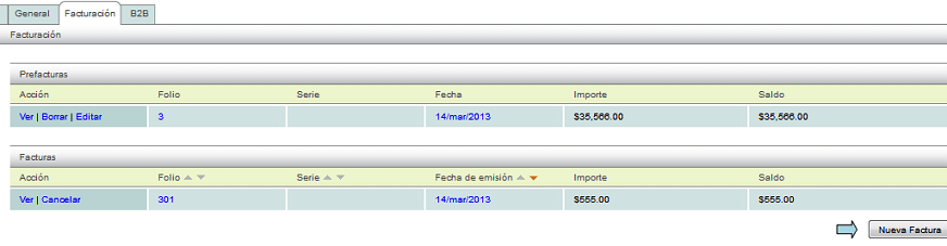 La pestaña facturación le permite visualizar de una forma rápida aquellos comprobantes y prefacturas que están registrados a nombre del cliente seleccionado, así mismo, puede generar una factura electrónica directamente a dicho cliente dando click sobre el botón "Nueva Factura".