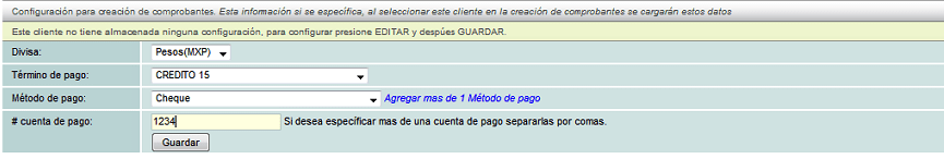 También puede registrar de forma predeterminada información del método de pago y número de cuenta, término de pago y divisa de facturación.