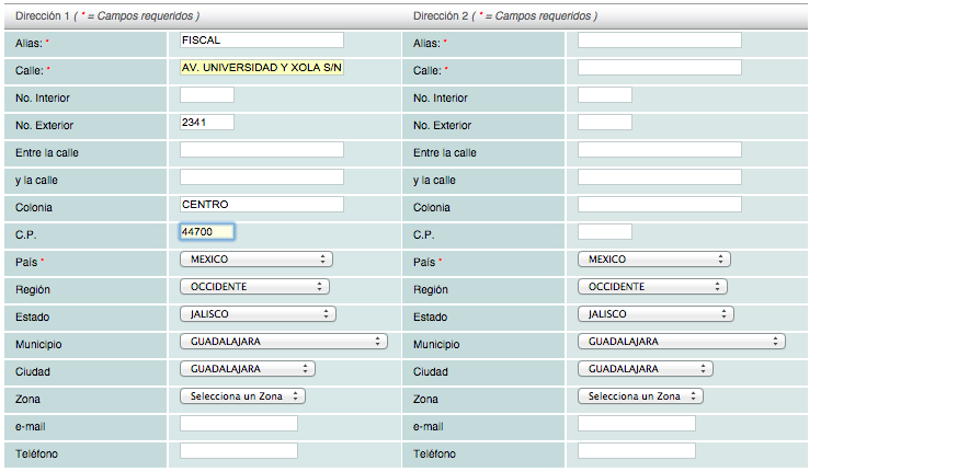 Datos solicitados: Alias (título de la dirección ingresada, esto le ayuda a identificar las diferentes sucursales que pueda tener su cliente), calle y número, país, estado, ciudad, C.P, etc. Las ciudades, regiones y municipios están precargados en el sistema de acuerdo a la lista publicada por el INEGI.