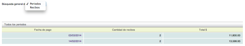 El sistema de nóminas dé Solución Factible® le permite filtrar los recibos realizados ya sea por “Periodos” o “Recibos” de este modo usted tendrá el control de cada recibo expedido. Para hacer uso del filtro dé click en el apartado “Búsqueda general de” donde encontrará información general como la fecha de pago, cantidad de recibos generados en dicha fecha y total del periodo.