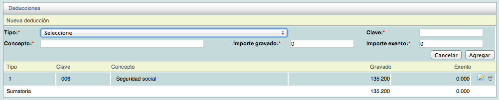 En el siguiente bloque debe ingresar cuantas “Percepciones” tenga el empleado, para realizar esta acción seleccione el tipo de percepción que va a registrar, en seguida ingrese el importe gravado o exento así como la clave. Cuando termine dé click en el botón “Agregar”.