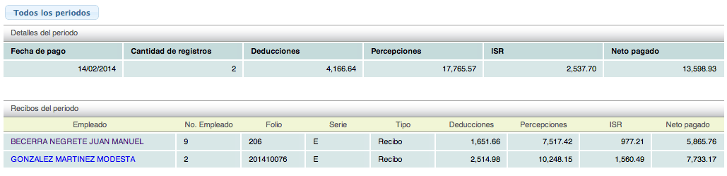 Al dar click sobre el periodo, el sistema le mostrará los recibos generados en dicho periodo, así mismo podrá observar el resumen del periodo.