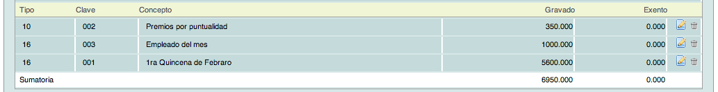 Cuando termine de agregar sus percepciones podrá observar el resumen de las mismas y su sumatoria.