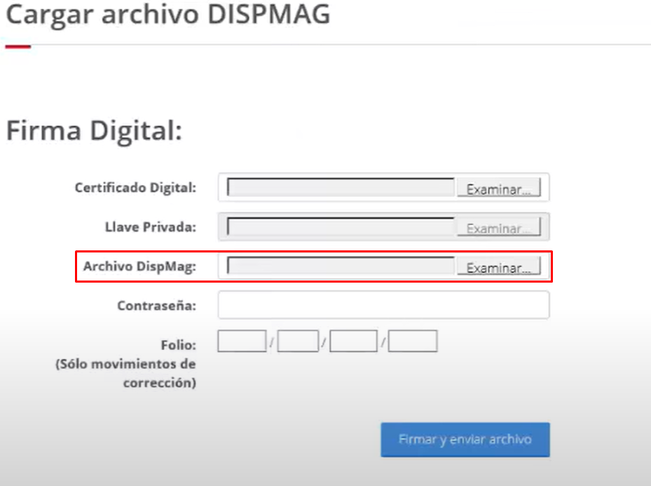 Dentro del módulo de "Movimientos Afiliatorios" buscamos la sección "Cargar archivo DISPMAG" y completamos los datos del formulario, en la opción "Archivo DispMag" vamos a cargar el archivo TXT: