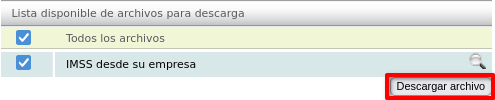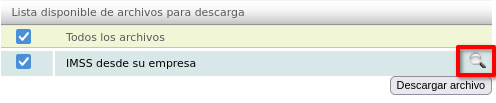 Después activamos la casilla de "TODOS LOS ARCHIVOS" o "IMSS DESDE SU EMPRESA", al hacer esta acción el sistema deberá de mostrar el icono de una lupa en el lado derecho cómo se muestra en la imagen: