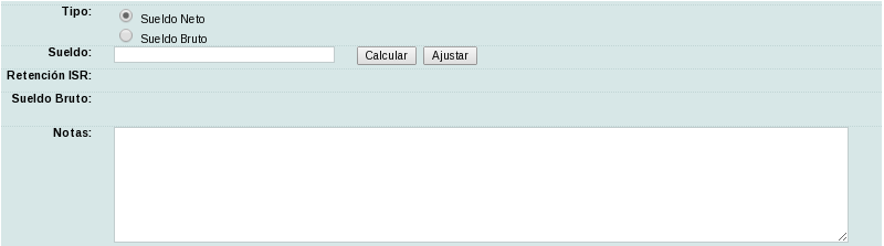 Cuenta con dos opciones para ingresar el sueldo del empleado, si es “Sueldo Neto” tan sólo ingrese la cantidad a pagar, para el caso de “Sueldo Bruto” active la casilla e ingrese la cantidad a pagar, en seguida dé click sobre el botón “Calcular”, de este modo el sistema realizará el cálculo de los impuestos.