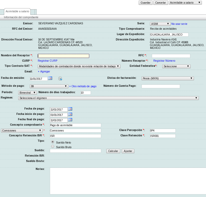 En seguida visualizará el formulario para la creación del comprobante, es importante que cuente con toda la información necesaria, al igual que en la generación del recibo de nómina, previamente tendrá que registrar al "empleado/comisionista" en el sistema, si cuenta con alguna duda vea el tema “Crear Empleado”.