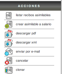 Para crear un nuevo recibo dirijasé al menú “Acciones” y dé click en el botón “Crear asimilable a salario”.