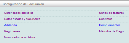 Para ingresar al panel, diríjase al módulo "Facturación" y dé click en la opción "Configuración" ubicada en el menú "Acciones".