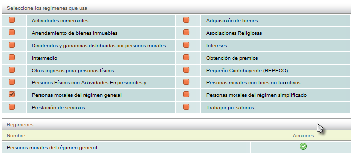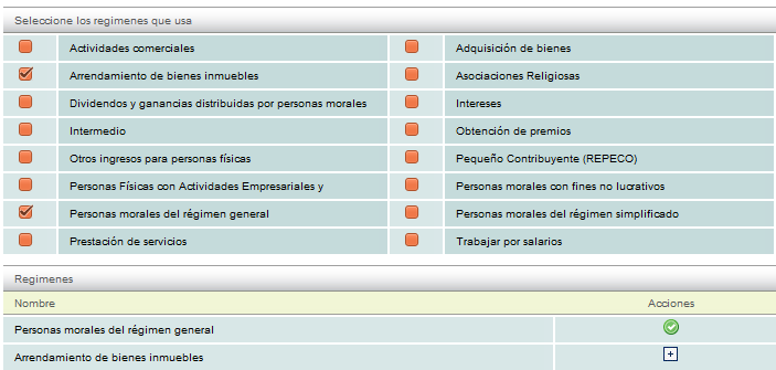 Para cambiar o agregar un régimen tan sólo habilite o deshabilite la casilla de su elección, cabe mencionar que puede tener más de un régimen seleccionado.