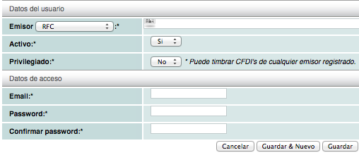 - Privilegiado: esta opción le permite al usuario timbrar comprobantes de cualquiera de los emisores registrados en el panel, si no lo desea así, seleccione NO en esta opción (recomendado).