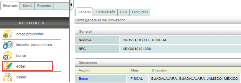 Una vez registrado su proveedor usted puede realizar varias actividades, dentro del menú Acciones como editar, borrar o clonar a dicho proveedor, así mismo dentro del panel principal podrá encontrar algunas acciones a realizar. A continuación le indicaremos el uso de cada una de ellas.