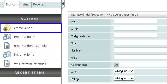 To perform this action, click on the option Create Vendor located in the menu Actions.