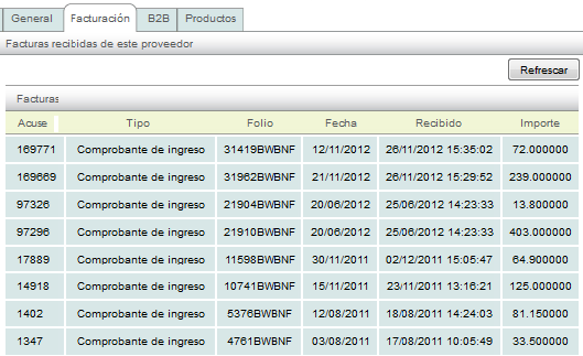In the tab "Facturación" you will find a list of all the receipts previously uploaded from the vendor in question.