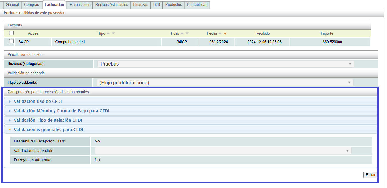 This option allows you to configure the parameters to validate the receipts received from your vendors, as well as the exclusion of validations that are established in the SAT error matrix.