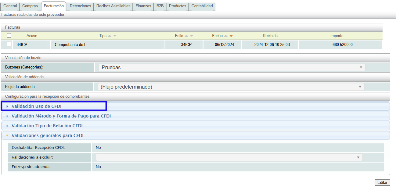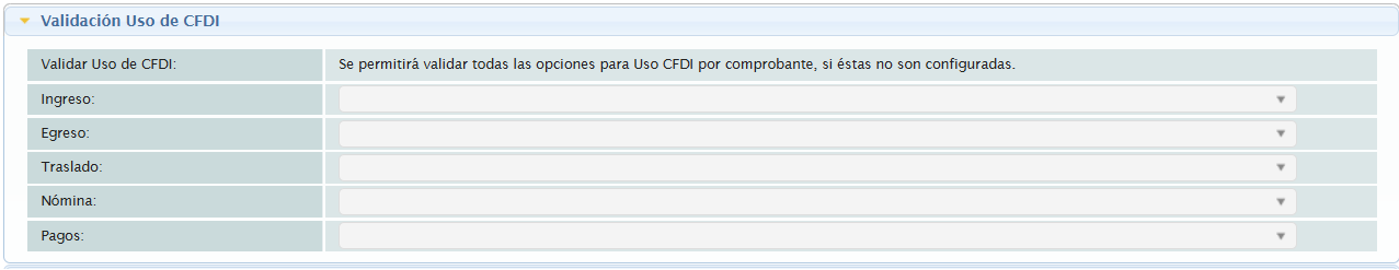 To validate the default UsoCFDI that the XML receipts received must contain with respect to the type of receipt, it is necessary to display the option "Validación Uso de CFDI".