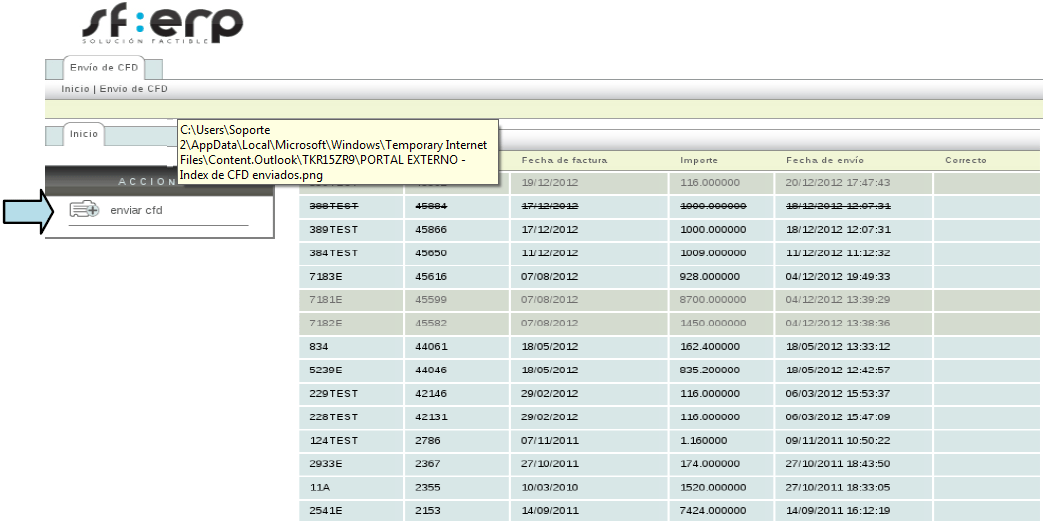 Once logged in, your vendor will be able to upload the receipts. To do this, click on the Enviar CFD option located in the menu "Actions".