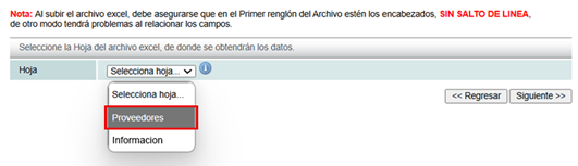A continuación, seleccione la hoja de excel que contenga los datos del proveedor a importar y de click en "Siguiente".