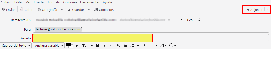 En el campo “Asunto” podrá indicar un título para este correo; el texto es libre y sin consecuencias fiscales, por lo que puede escribir cualquier referencia que señale el origen del CFDI.